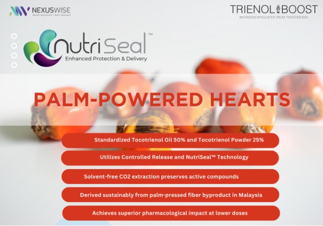 TRIENOLBOOSTTM is the next generation of vitamin E, tailored to address cardiovascular (CVD) health, as well as provide protection for the heart and liver. This innovative product represents a potent blend of upcycled palm products and palm tocotrienol bioactive complexes. There are two different forms available for TRIENOLBOOSTTM - with the Standardized Tocotrienol Oil (50%) and Tocotrienol Powder (25%). TRIENOLBOOST™ is equipped with enriched fraction where - Superior Efficacy with Lower Dosage needed. It uses solvent-free CO2 extraction to preserve more active compounds compared to conventional palm tocotrienol (Zainal et al., 2022; Meganathan & Fu, 2016).